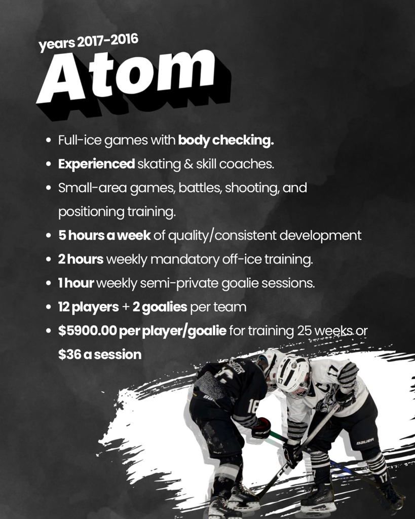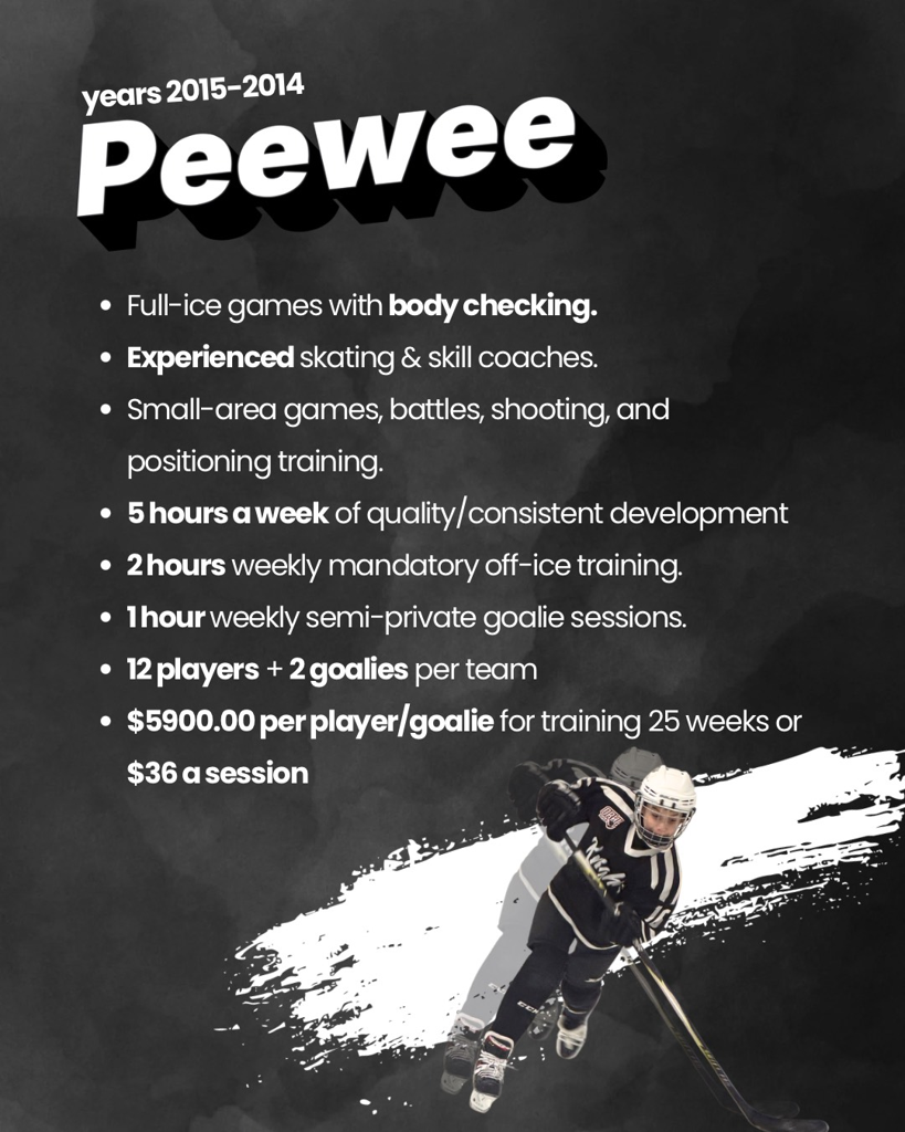 We will be fielding development teams in the U9, U11, U13, U14, U16 age categories. Each team will consist of only 12 players (7 F and 5D) and 1-2 goalies. U14 and U16 teams have the option of carrying more players due absences due to injury and high school sport.